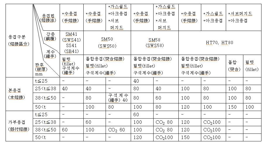 * 용접(熔接)의 최저예열온도(最低豫熱溫度)와 최고층간온도(最高層間溫度) (℃)